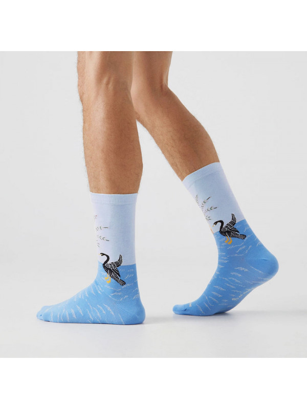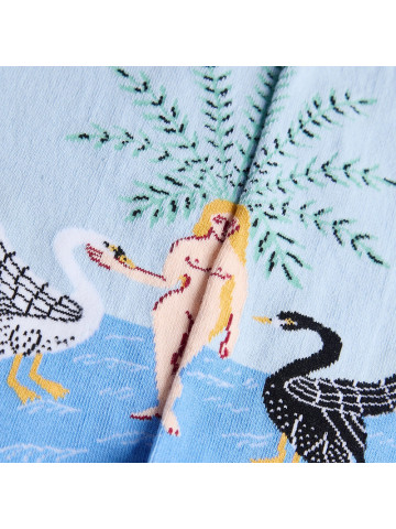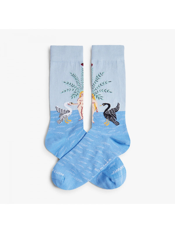 Calcetines unisex en azul claro con dos figuras clásicas y detalles oníricos únicos.