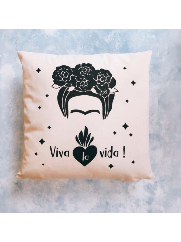 El cojín FRIDA - VIVA LA VIDA nació de un momento de mi propia reflexión sobre la artista mexicana. Es un personaje de la historia que ha marcado a mucha gente y a más aún a través de representaciones coloridas en la moda y la papelería de los últimos años, por ejemplo, casi hasta saturar su imagen. Sin embargo para mí, después de leer un poco en biografías de la artista, representa la más absoluta dualidad en las relaciones humanas. A nivel artístico Frida Kahlo puede resultar fascinante, pero donde más me impactó a mí fue en la complejidad de sus relaciones personales, donde la absoluta modernidad convivía con pensamientos y actos absolutamente opuestos, romances que se podrían considerar muy feministas y sin embargo la relación con Diego Rivera siempre me pareció digna del clásico "Amiga, date cuenta"...