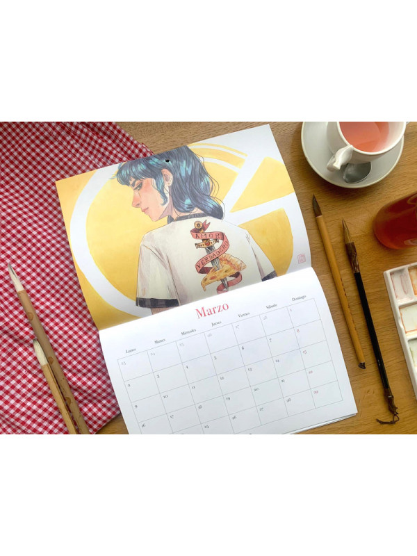 Las cubiertas del calendario están impresas en papel de 250 gr. y plastificadas con barniz mate. Las páginas interiores están impresas en papel estucado mate de 180 gr. El calendario va encuadernado a caballete grapado y tiene un orificio en la parte superior para poder colgarlo en la pared.