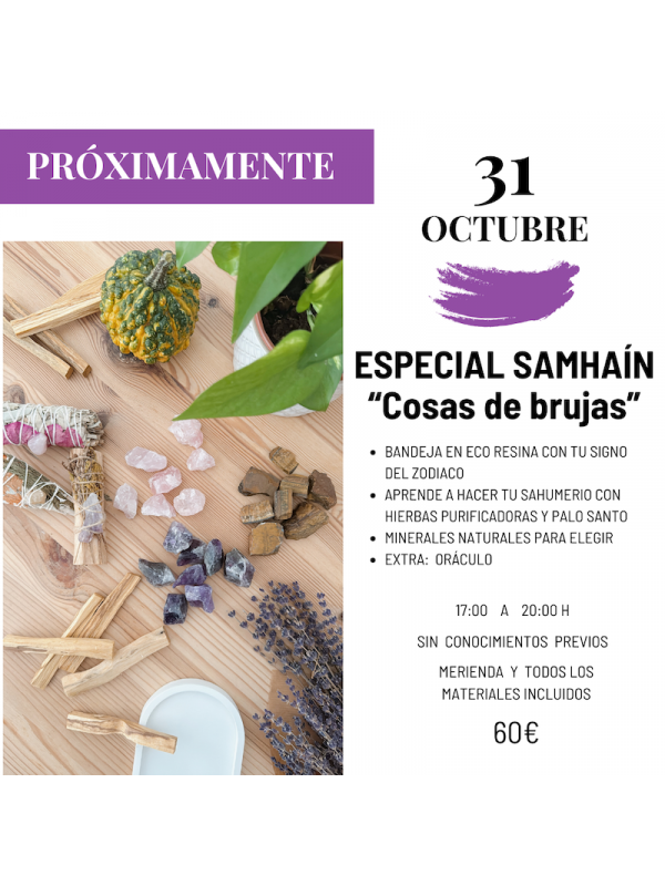 El VIERNES 31 de OCTUBRE tenemos taller ESPECIAL SAMHAÍN "COSAS DE BRUJAS" en el que vamos a ayudarte a reconectar contigo misma, renovar y recargar energías. El taller está impartido por OFELIA, la diseñadora de joyas y artesana de Camaleónica Design. Con más de 10 años de experiencia impartiendo talleres te ayudará a hacer tu propio kit para Halloween / Samhaín y disfrutar de uno de los momentos más mágicos del año según la tradición celta. Será un taller muy especial de meditación y conexión contigo misma.
