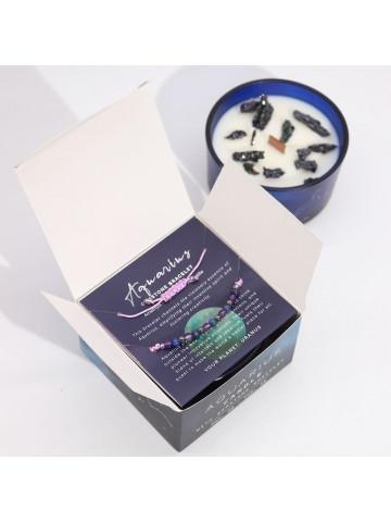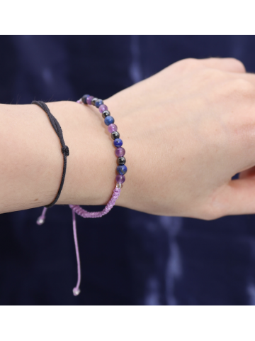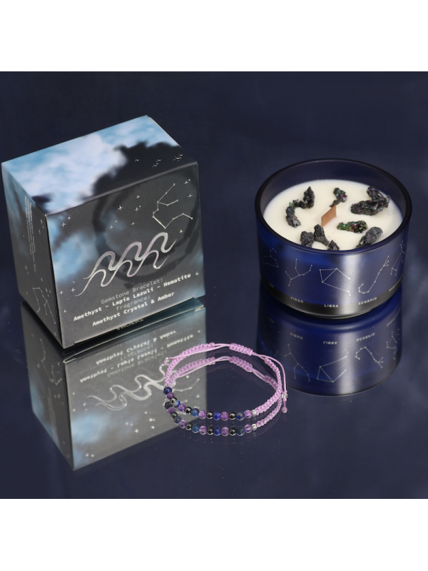 Viene acompañada de una pulsera con los minerales más afines al signo: Amatista, lapislázuli y hematites.